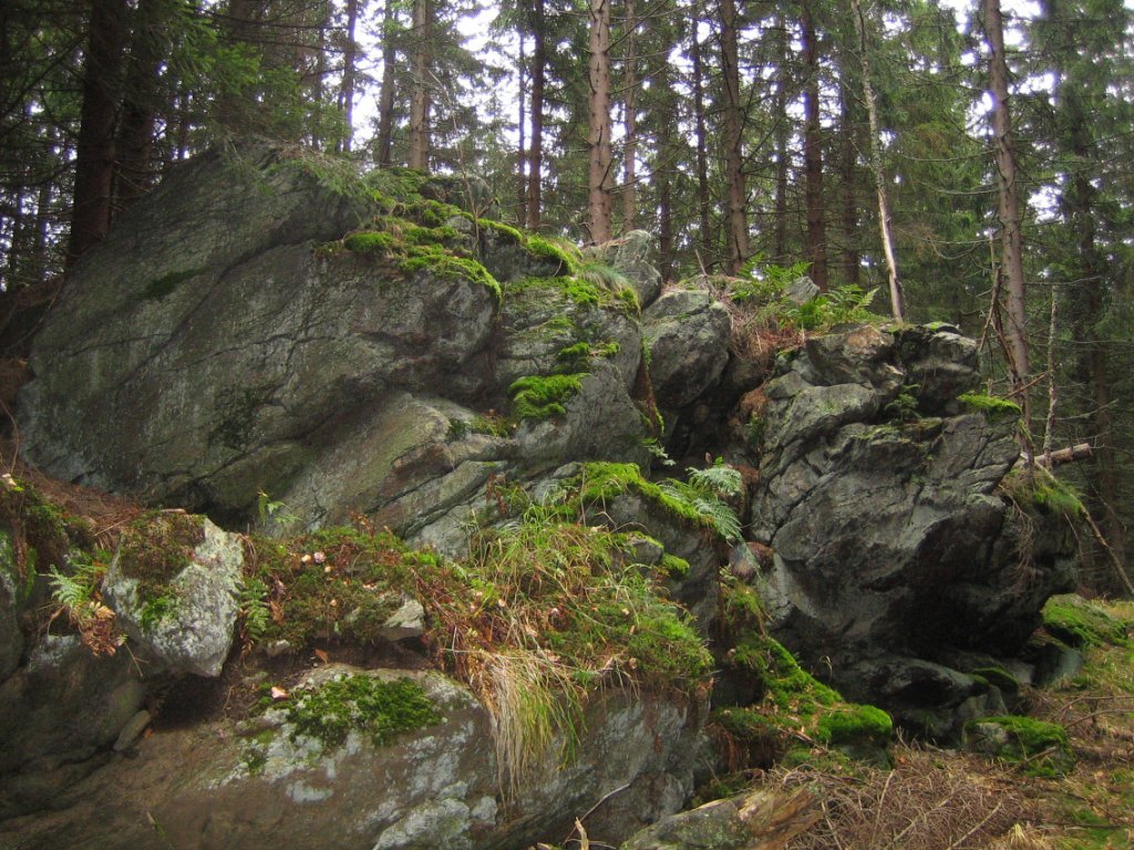 začínají první Větrné skály. Lom už dávno neexistuje. Dalším místem, kde